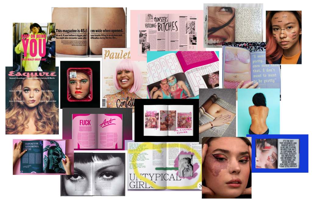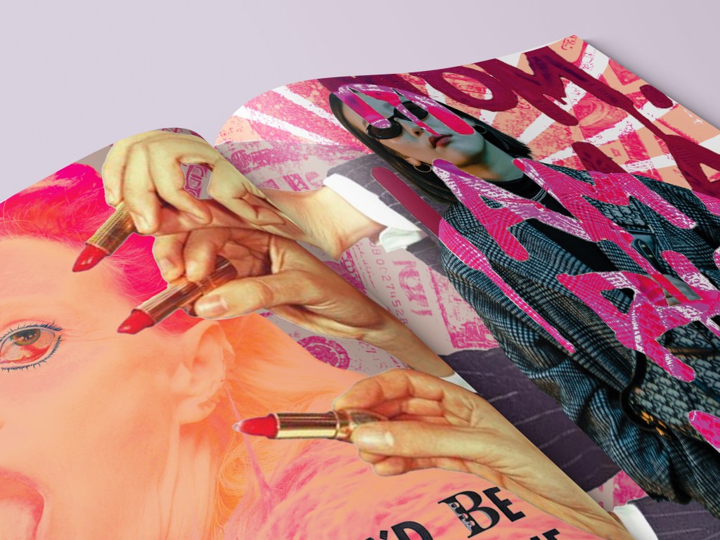 There is a feminine grunge aesthetic to this publication, especially prevalent within the collage art. The bold color scheme of red, pink, and black tie in perfectly with the mixture of vintage and modern images. Furthermore, the collage art within this project is meant to replace promotional ads and further represent the complexity of what it means to be a woman.