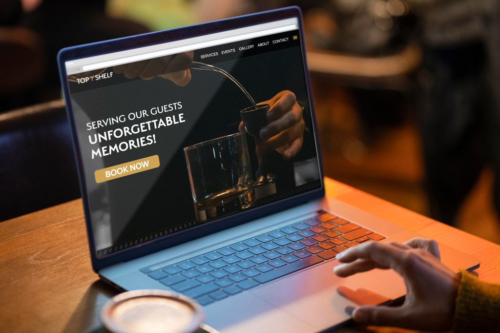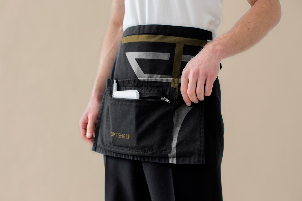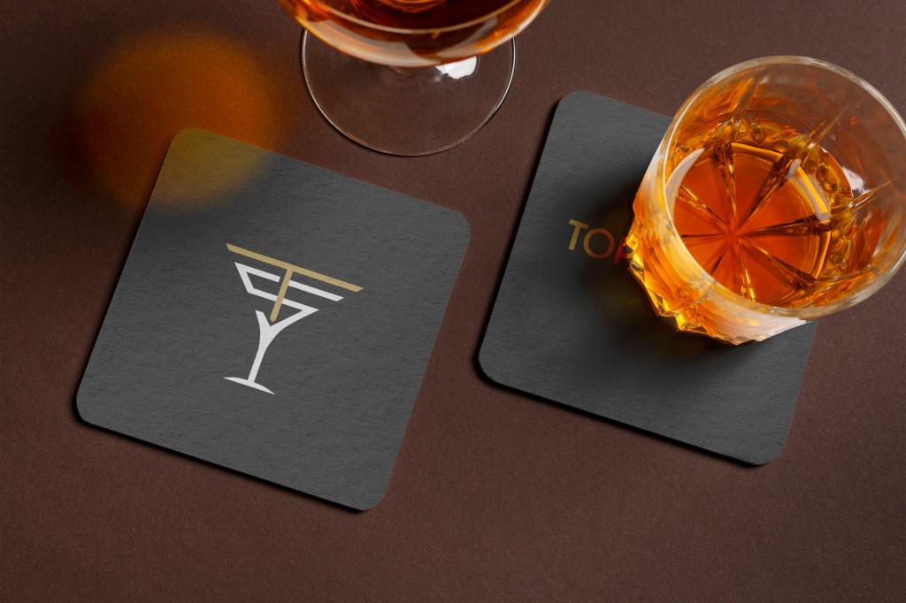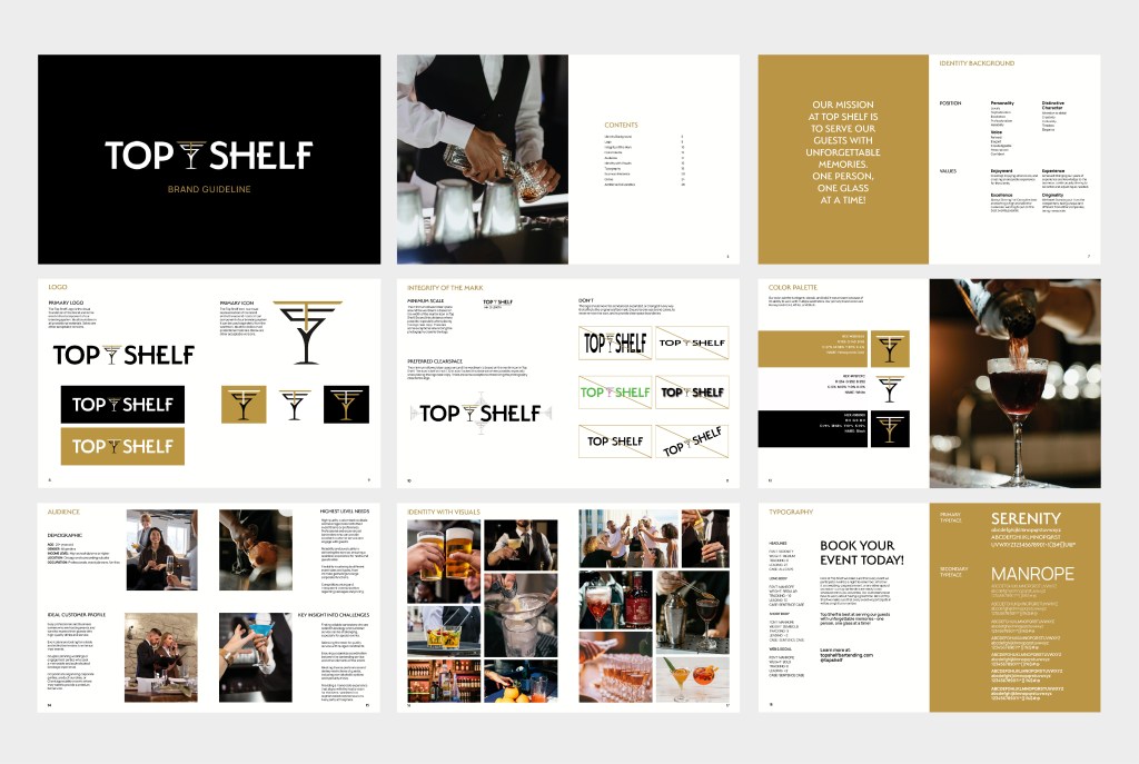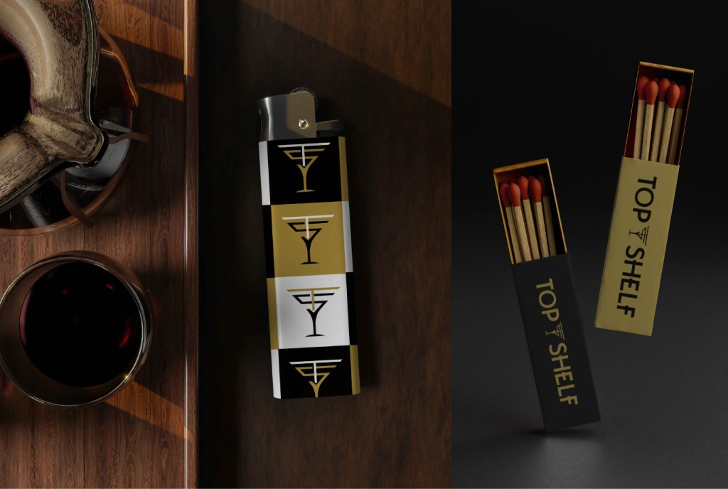 Top Shelf is a mobile bartending service that caters for special events. The brand is anchored around a martini ___ that is used as the main mark and also as a recurring graphic device.